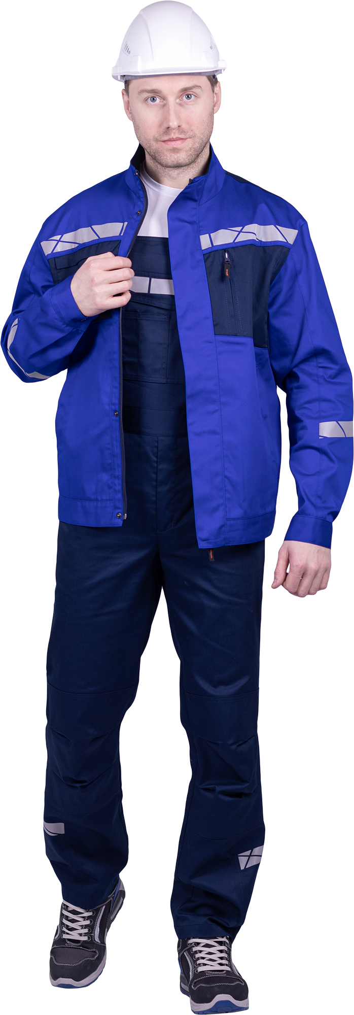• горизонтальная термоклеевая световозвращающая полоса шириной 30 мм располагается по клапану нагрудного кармана, вверху спинки, низу брюк в области боковых швов.